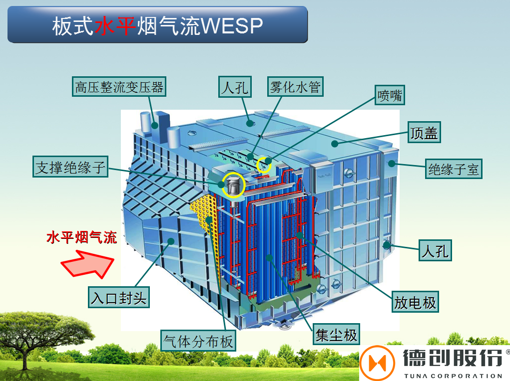 Shell, inlet smoke box, discharge electrode, collecting electrode, washing system, circulating water system, high voltage power supply, outlet smoke box, air flow distribution plate, electronic control system and son on